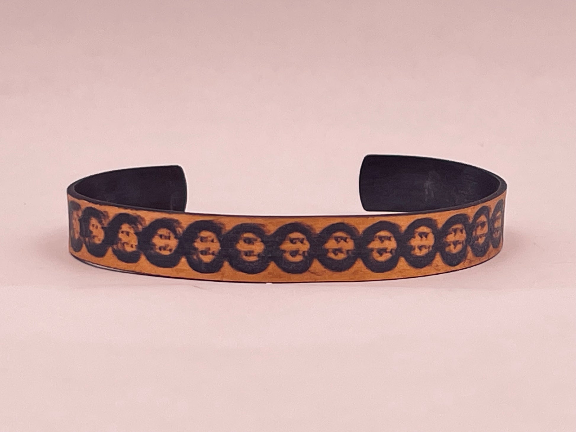 Copper bangle, embossed with circled lace, patinaed, sealed