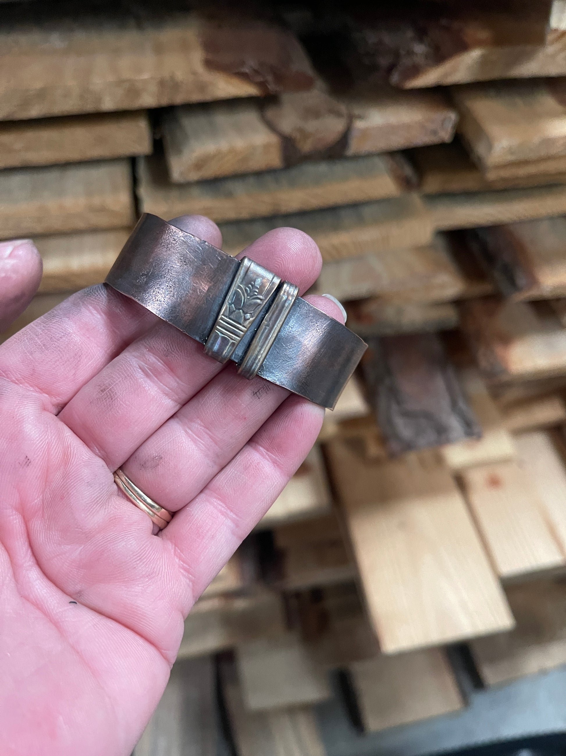 6” copper cuff with spoon handle pieces.
