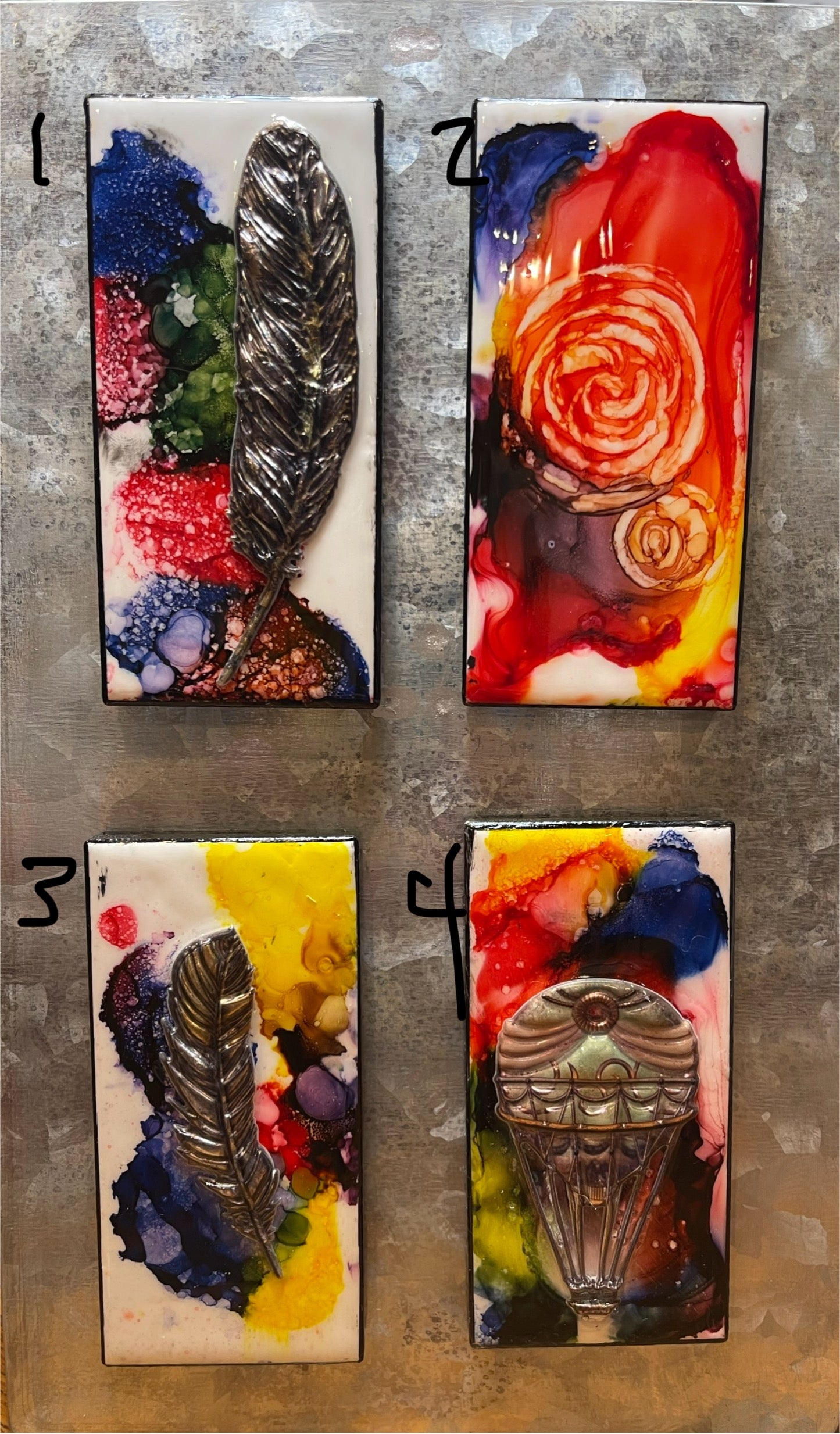 2“ x 4“ ceramic tile, alcohol ink, random embellishments, sealed in resin. Choose the number of your design, put that number in the notes box when ordering.