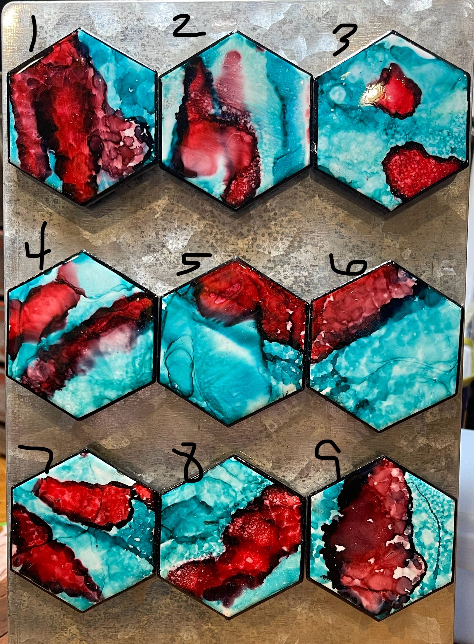 Hexagon, ceramic tile, alcohol, ink, resin. Choose number of design put that number in the notes section when ordering.